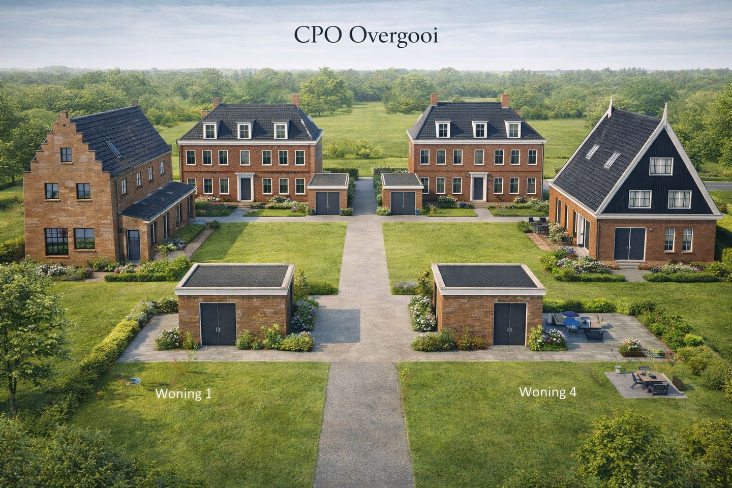 Alle woningen zijn verbonden door een gezamenlijke entree met een poort, toegangsweg, groen en een gazon/gras¬tegels/voetbalveldje/speeltuin. En er is naast een eigen tuin ook een gezamenlijke tuin. De precieze invulling kan met elkaar bepaald worden.