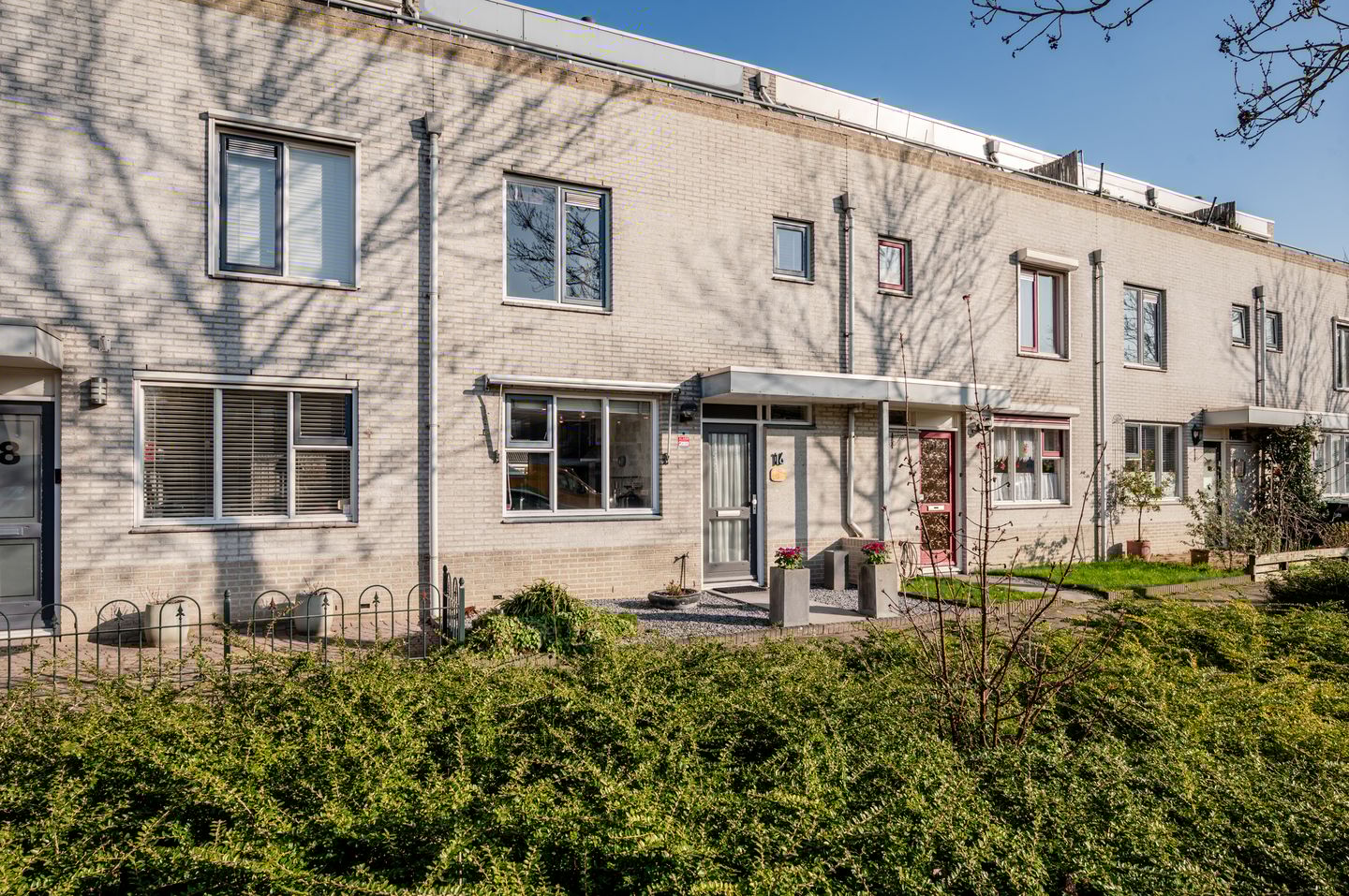 De achtertuin is keurig aangelegd met een combinatie van nette bestrating en groene borders. Hier geniet je van rust, ruimte en privacy. Extra fijn: schuin achter de tuin ligt een speeltuintje – ideaal voor gezinnen met jonge kinderen.