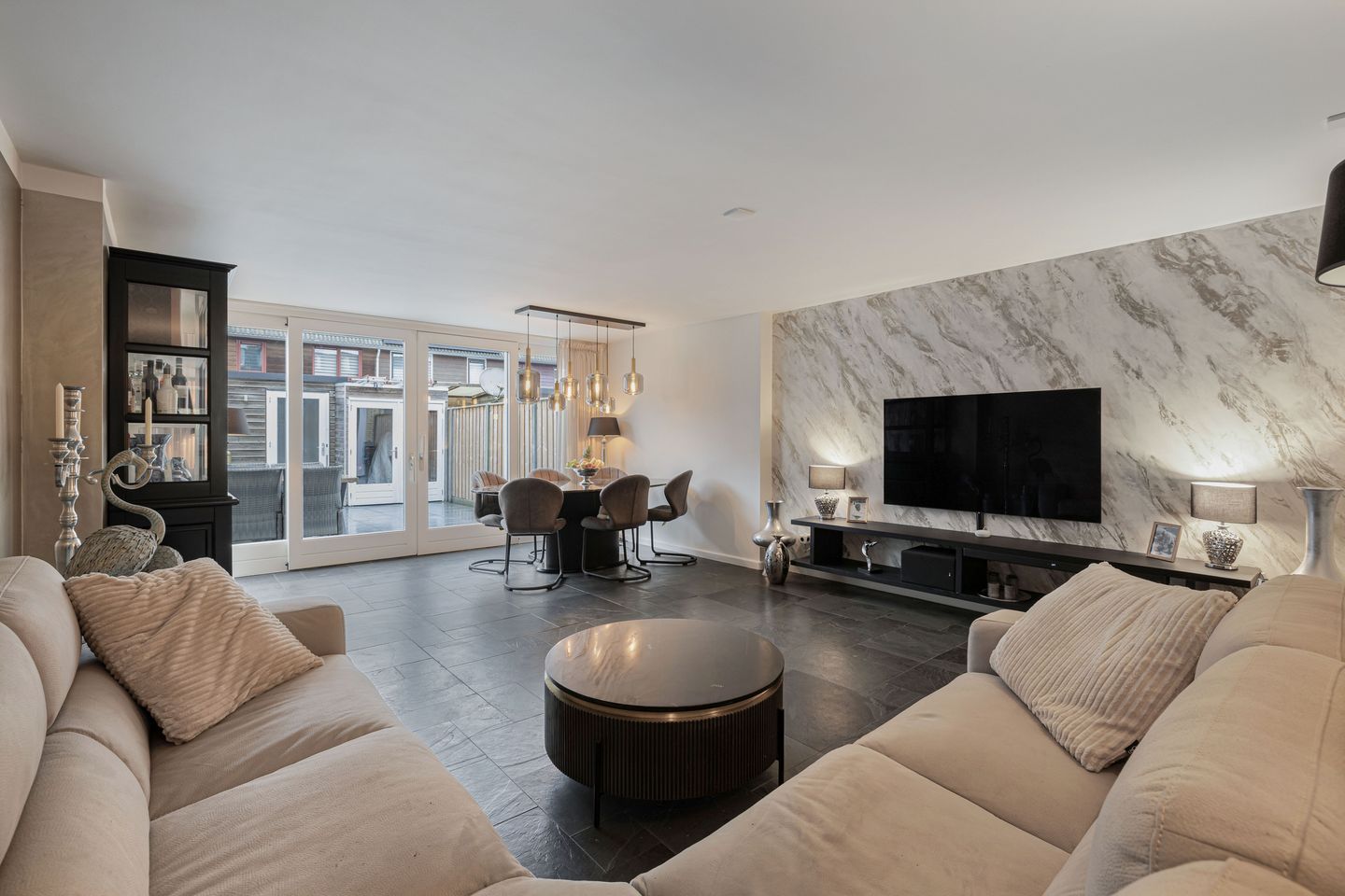 De woonkamer biedt volop ruimte voor een grote zithoek én een royale eettafel. Extra bergruimte vind je in de handige trapkast. Achter het tv-meubel is prachtig Venetiaans stucwerk toegepast – een echte eyecatcher!