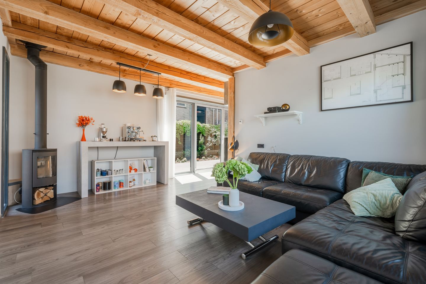 De woonkeuken is een echte eyecatcher: strak en stijlvol uitgevoerd met een luxe Poggenpohl-keuken, RVS werkblad en hoogwaardige inbouwapparatuur waaronder een inductiekookplaat, vaatwasser, Quooker en Bosch combi oven/magnetron en afzuigkap. Aan de andere zijde van de woning vindt u de gezellige woonkamer – een fijne plek om met het gezin te ontspannen, zeker op koude dagen bij de knusse houtkachel.
