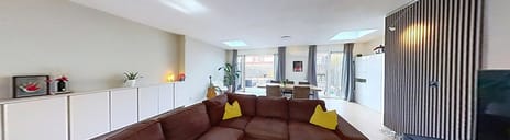 Entrance to the house with the meter cupboard, toilet, under-stairs cupboard, staircase to the upper floor, and access door to the living room in the hall. The extension makes the living room not only wide but also extra long. This gives you plenty of living space and allows you to enjoy the beautiful double-sided fireplace, which creates a lovely separation between the living room and the kitchen. The extension was installed in 2021, and thanks to the two curved VELUX glass domes (100x100 cm), which still have a six-year warranty and are fitted with burglar-resistant glass, you can enjoy beautiful natural light. Both domes are equipped with motorized pleated blinds with wireless operation. The extension has hot and cold water connections, a private exterior door, separate heating, a private skylight, and individually controlled lighting and blinds. The screed floor is already prepared with a drain and an additional heating connection, making it easy to create a self-contained room and preparing the house for lifelong living. All walls and ceilings have a sleek, smooth finish and are fitted with recessed spotlights. The floor is covered in a herringbone laminate, and four-season air conditioning ensures a comfortable climate even on warmer days. The ground floor is also equipped with a comprehensive, subscription-free home alarm system with smoke, door, and motion detection.