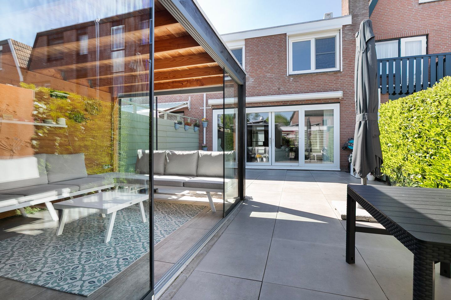 De zonnige achtertuin is bereikbaar via de schuifpui in de woonkamer. Deze onderhoudsvriendelijke tuin is keurig aangelegd en biedt volop ruimte voor een loungeset of buitentafel. Achterin de tuin bevindt zich een overkapping, die u het hele jaar door kunt benutten voor ontspanning of opslag. Via deze overkapping heeft u direct toegang tot de berging én tot de carport aan de achterzijde – ideaal voor fietsen, gereedschap of het parkeren van uw auto onder een vaste plek.