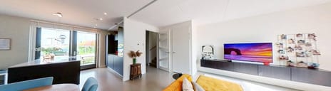 - Woonkamer met hippe gietvloer en grote schuifpui;