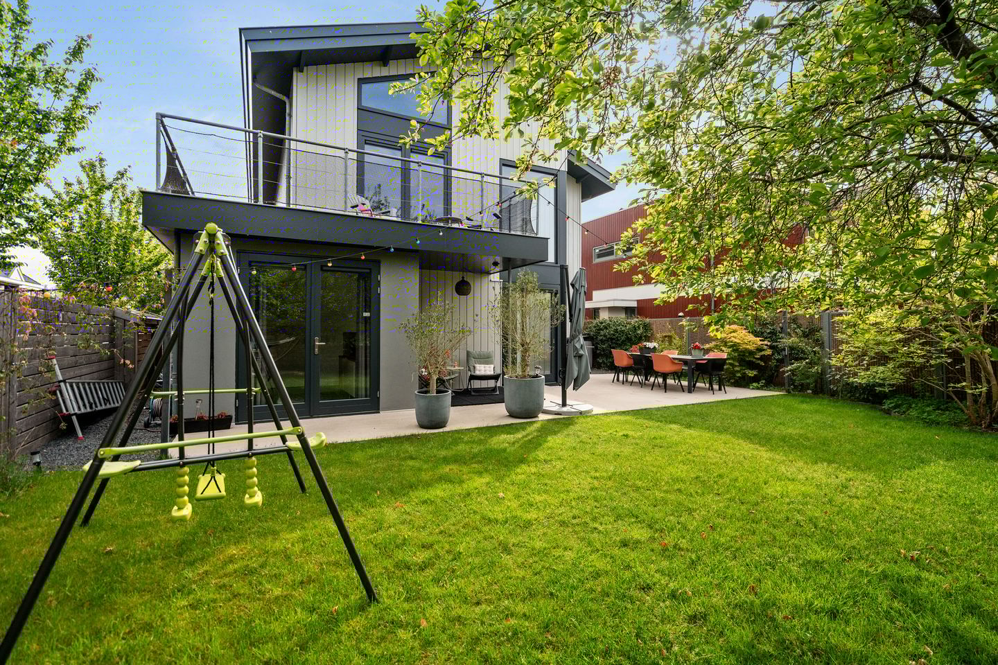 Step inside and immediately feel the openness and light. The spacious entryway leads into an open living space with playful ceiling heights and stunning views of the garden and park. The living room, featuring large windows and a stylish fireplace, is a perfect place to relax. At the heart of the home is the luxurious kitchen with a cooking island — an inviting place for long dinners and drinks with family or friends. Also on the ground floor is an extra (bed)room with French doors to the garden, ideal as a home office, playroom, or guest/extra bedroom.