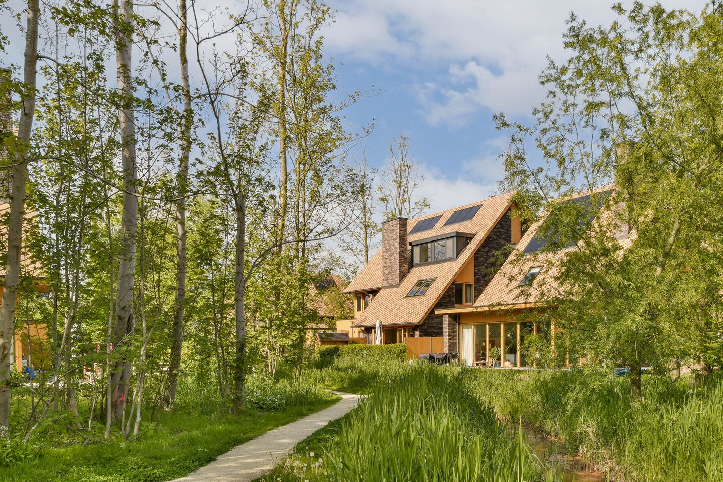 De woningen in Boomrijk hebben stuk voor stuk een unieke uitstraling. Dit huis van het type Redwood is direct herkenbaar door zijn bijzondere architectuur: een dak dat doet denken aan een bladerdek, een gevel met een boomschors-achtige afwerking en kozijnen van duurzaam accoyahout. De kleuren en materialen sluiten perfect aan bij de natuur eromheen.