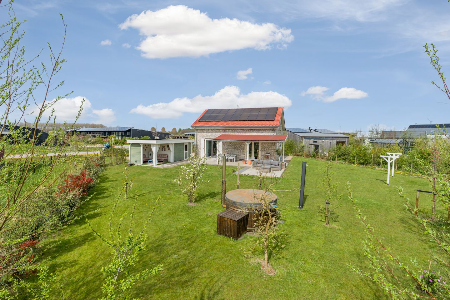 De royale kavel van circa 1.144 m² omarmt de woning en biedt een oase van privacy en vrijheid. De tuin is geen strak aangelegd geheel, maar een levendig, groen landschap dat perfect past bij liefhebbers van natuurlijk en landelijk wonen. Hier geen standaard tuinen, maar ruimte voor eigen invulling: een moestuin, bloemenweide of gewoon een plek om te genieten van het buiten zijn. Met een ruim zonneterras, een verzorgd gazon met hot tub en een sfeervolle overkapping met grote berging is dit een tuin waar elk seizoen zijn charme heeft. Een plek waar u vertraagt, oplaadt en écht thuiskomt.