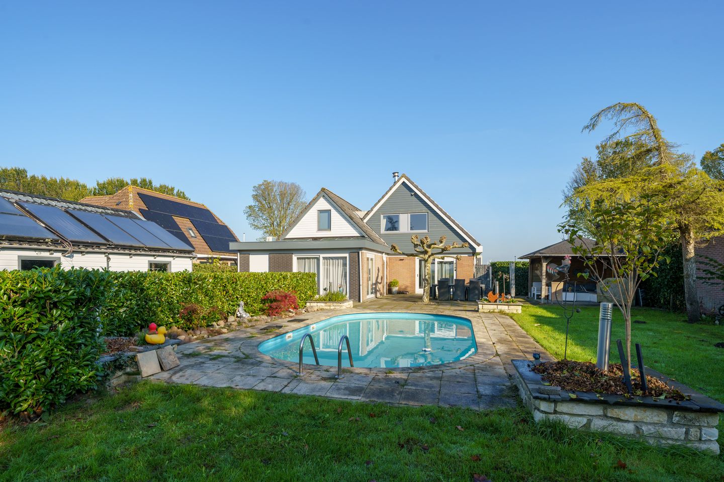 Het eerste deel van de tuin is aangelegd met een fraai zwembad. Het achterste deel is thans een paardenweide.