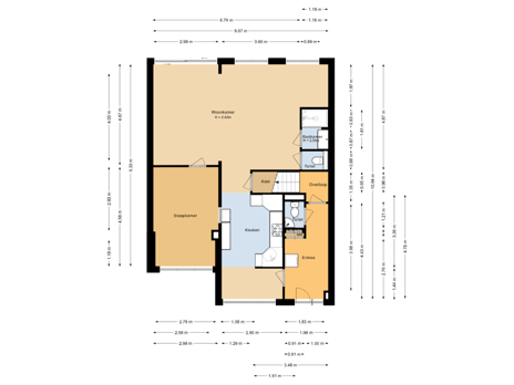84 m² (8,60 meter diep en 9,80 meter breed)