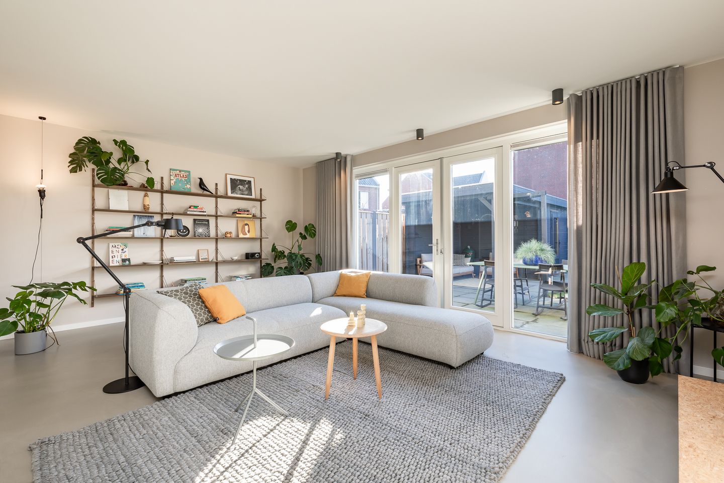 Wat een ruimte biedt de tuingerichte woonkamer! Hij is licht en sfeervol en heeft mooie openslaande deuren naar de diepe achtertuin op het zuidwesten. De wanden zijn voorzien van stucwerk, de vloer van een gietvloer met vloerverwarming. De breedte komt hier pas echt goed tot uiting. Deze kamer straalt rust, balans en ruimte uit.