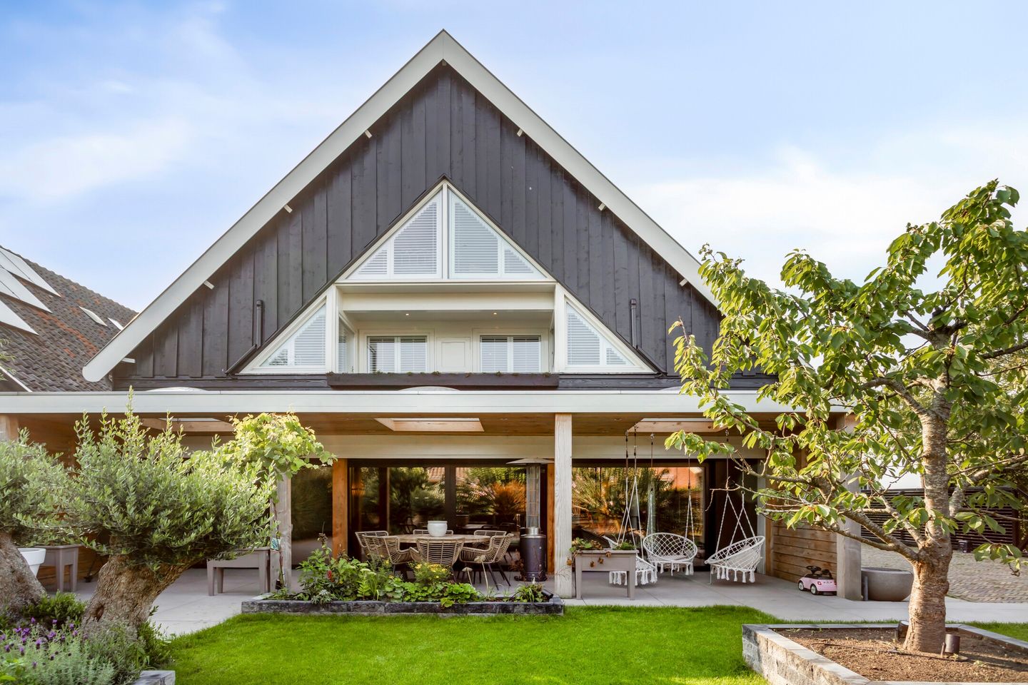 Binnenkomen is hier een beleving op zich. Je stapt binnen in een ruime hal met vaste kasten voor garderobe en stofzuiger. Het vernieuwde toilet straalt pure luxe uit. De living met grote open keuken is een geweldig gave leefruimte met veel licht door de grote raampartijen. Een enorme glasgevel met dubbele schuifpui opent naar het overdekte terras – ideaal voor het buitenleven. Het schitterende timmerwerk, de paneeldeuren en het strakke lijnenspel geven niet allen de begane grond maar ook de verdieping een warme, moderne sfeer. Overal zie je het indrukwekkende spantwerk terug komen, er is veel gebruik gemaakt van extra ramen, ook langs de overloop om zoveel mogelijk licht naar binnen te krijgen. De palletkachel, die is aangesloten op de cv-installatie, zorgt voor comfortabele en efficiënte verwarming.