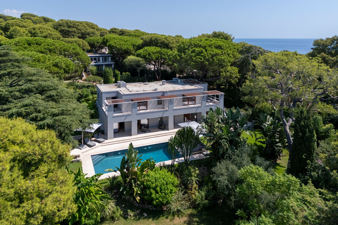 The flat garden of 1,840 m², facing South and West, offers optimal sunlight throughout the day and provides a beautiful sea view from the first floor. The pool extends from the terrace, creating an ideal outdoor space for relaxation. The generous garage accommodates up to 3 cars.