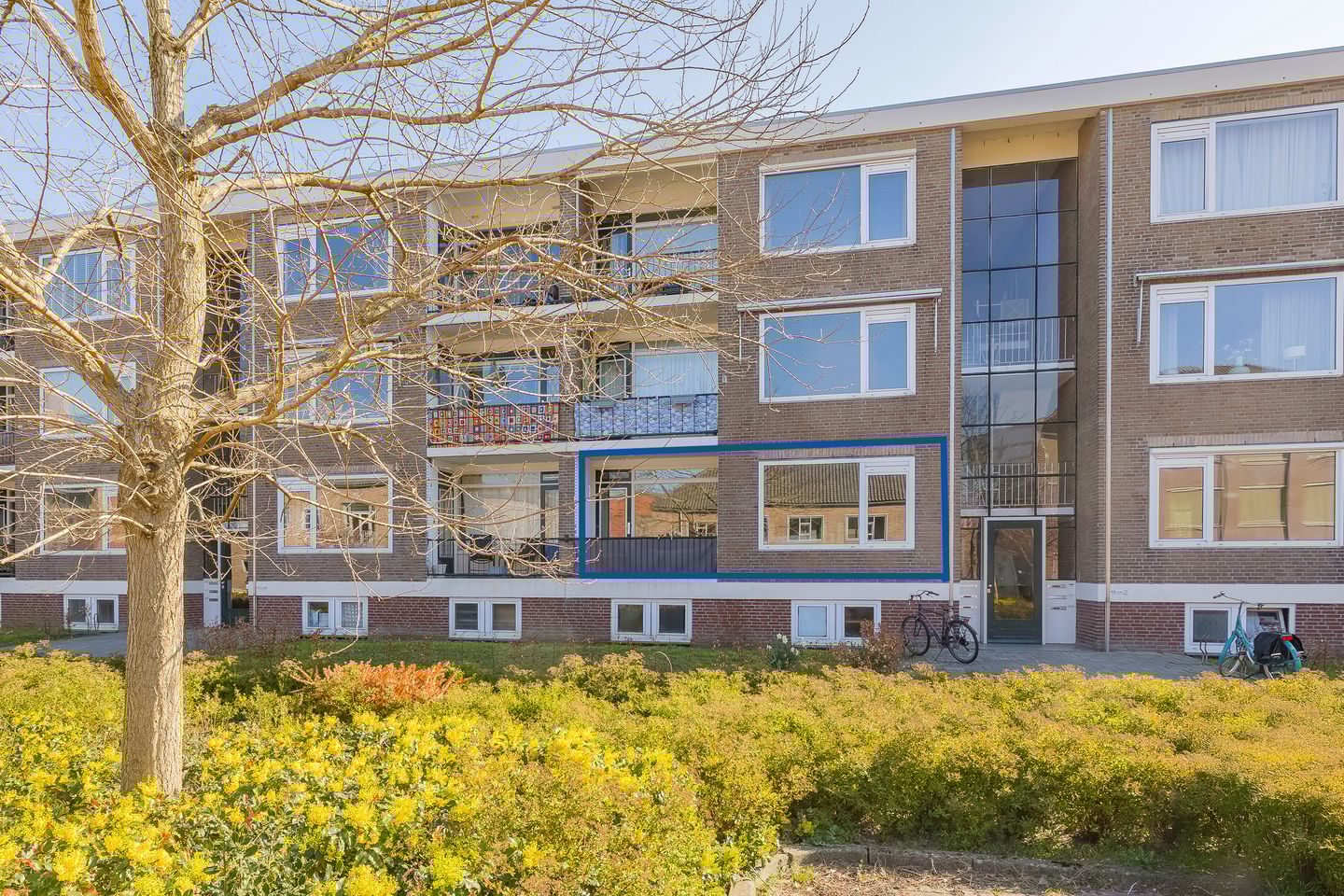 Aan de voorzijde van het complex treft u de overdekte entree van het complex, hier zijn ook de postbussen en het bellentableau gesitueerd. U kunt met de trap naar het souterrain, hier bevindt zich de (fietsen)berging. Neemt u de trap naar de 1e woonlaag, dan komt u bij de voordeur van het appartement.