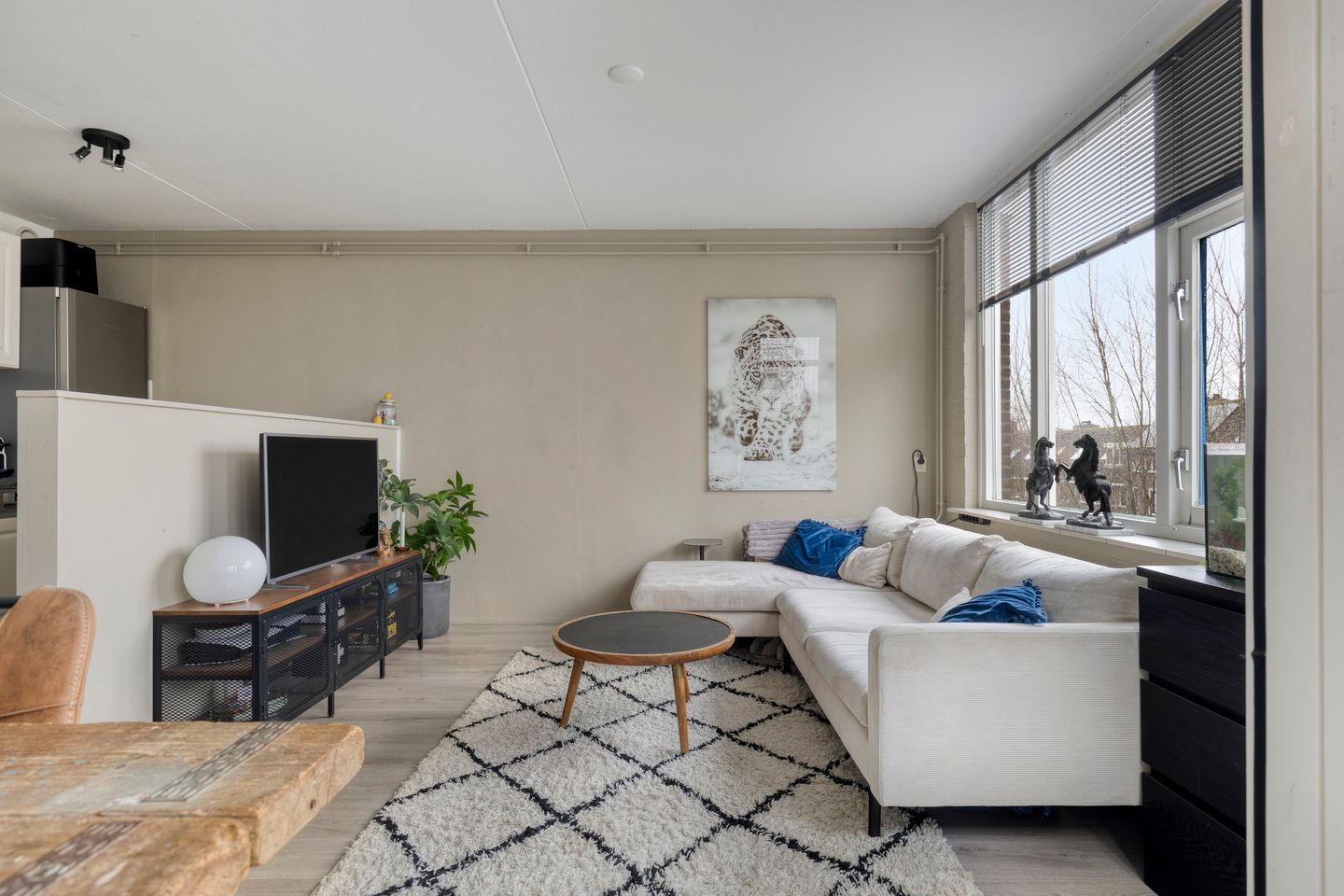Aan de achterzijde van het appartement bevindt zich de heerlijk lichte woonkamer met open keuken. Dankzij de grote raampartijen komt er veel daglicht binnen en heb je een fraai uitzicht over een watertje en het groen. Ook vanaf het balkon (te bereiken vanuit de woonkamer) geniet je van ditzelfde uitzicht. Het balkon is gelegen op het oosten, waardoor je ’s ochtends en aan het begin van de middag heerlijk van de zon kunt genieten.