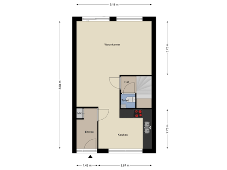 Tussen de keuken en de woonkamer is er een kleine 2e hal met het toilet en de trapopgang naar de 1e verdieping.
