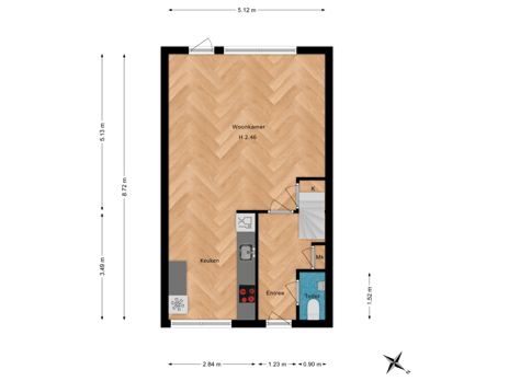Via de voortuin bereikt u de voordeur van de woning. U betreedt de entree waar voldoende ruimte voor een garderobe is. Ook heeft u vanuit hier toegang tot de toiletruimte, de meterkast en de woonkamer. De trapopgang brengt u naar de 1e verdieping.