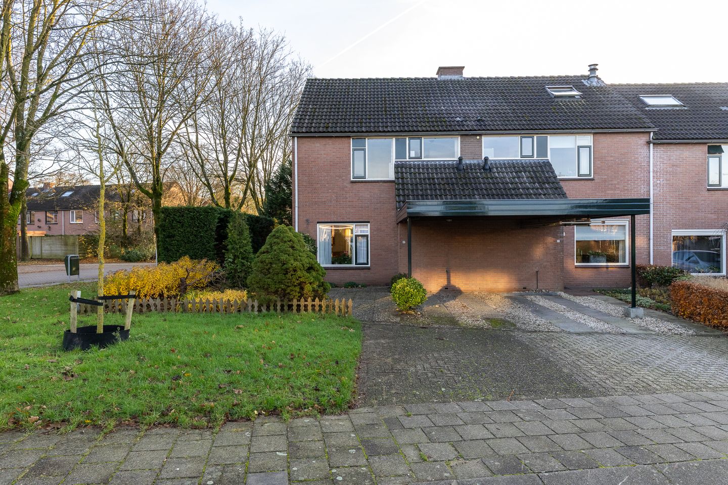 Aan de voorzijde van de woning bevindt zich de carport en de oprit. De oprit biedt plaats voor eventueel 2 auto’s. Ook in de omgeving is er voldoende openbare parkeerruimte.