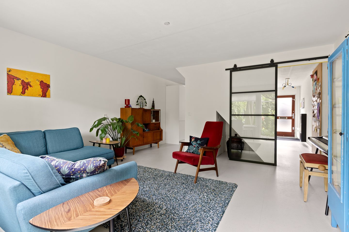 Bij binnenkomst vallen de duurzame Forbo marmoleumvloer, de strak gestucte wanden en de stalen schuifdeuren direct op.