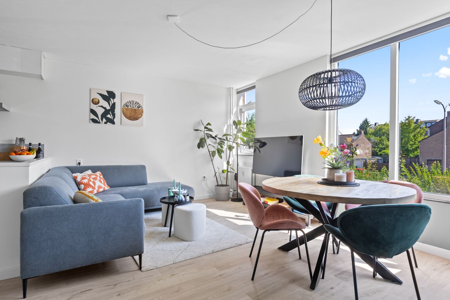 Via de hal stap je binnen in een woonkamer die direct uitnodigt om neer te ploffen. De open keuken, vernieuwd in 2022, vormt het hart van het appartement en is strak, modern en praktisch ingedeeld. Met een inductiekookplaat, afzuigkap, koel-/vriescombinatie, oven en vaatwasser heb je alles bij de hand. Het lage muurtje tussen keuken en living werkt als een subtiele scheidslijn, zodat je tijdens het koken toch contact houdt met je gezelschap. De zithoek voelt knus en comfortabel, een plek waar je ’s avonds tot rust komt. De ronde eettafel bij het raam maakt de ruimte compleet: ideaal voor een gezellige maaltijd of een ontspannen start van de dag met uitzicht naar buiten. Dankzij de vier ramen op de hoek baadt de kamer in het daglicht en voelt de ruimte extra open en levendig.