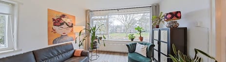 APPARTEMENT: In de ruime hal bevindt zich het moderne toilet en de meterkast waar ook de cv-ketel is geïnstalleerd. Wat opvalt is de glazen deur naar de woonkamer dat zorgt voor een ruimtelijk effect. De ruime woonkamer heeft door de hoekligging grote ramen waardoor er veel lichtinval binnenvalt en je mooi uitkijkt op de groene omgeving. Aansluitend bevindt zich de zijkamer; ideaal als thuiswerkplek, eetkamer of extra slaapkamer. Vanuit deze kamer heb je toegang tot het balkon.
