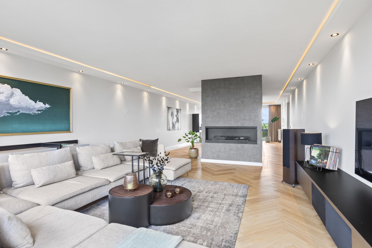 De roomdivider met bio-ethanol haard vormt de stijlvolle overgang naar de woonkamer. Hier is volop ruimte voor een gezellige zithoek, waar je heerlijk kunt relaxen met vrienden of een goede film. Dankzij de grote ramen heb je ook hier prachtig uitzicht en kun je in de avond genieten van een kleurrijke zonsondergang. De verlaagde koof met spotjes zorgt voor een warme, luxe sfeer.