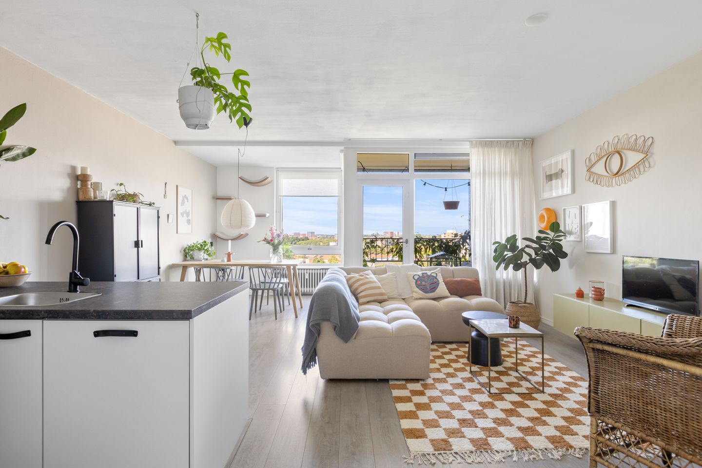 Via de lange hal kom je binnen in de lichte woonkamer waar je meteen de gezellige sfeer voelt. Plof lekker neer op de bank, zet een serie aan of staar gewoon even weg naar buiten – want dat uitzicht vanaf de 9e verdieping is echt een cadeautje! Doe de deur open en geniet van het balkon op hoogte: een perfecte plek voor een koffietje of een borrel aan het einde van de dag. Aan de andere kant van de woonkamer is er plek voor een ruime eettafel waar je gezellig dineert of werkt.