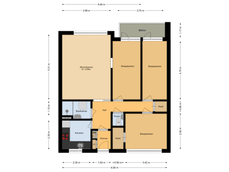 Aan het einde van de gang bevindt zich een handige, diepe vaste kast. Aan weerszijden hiervan liggen twee slaapkamers. De kinderslaapkamer (circa 9,5 m²) ligt aan de balkonzijde en heeft via een balkondeur direct toegang tot het balkon. De ouderslaapkamer (circa 10 m²) is gesitueerd aan de galerijzijde en beschikt over een vaste kast.