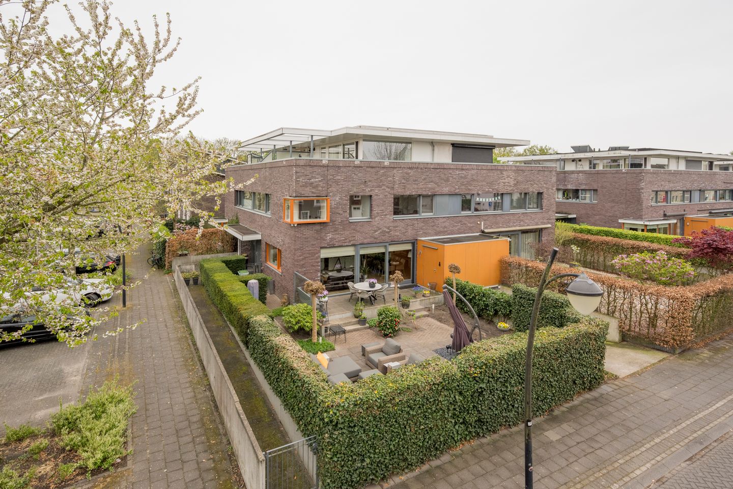 De living is een waar genot: omringd door ramen kijk je uit over de lager gelegen, besloten tuin – een speelse en groene oase van rust. Op de verdiepingen bevinden zich vier ruime slaapkamers. De slaapkamer op de bovenste verdieping beschikt bovendien over een royaal dakterras met een geheel eigen sfeer. Een fijn plekje op hoogte, perfect voor lange zomeravonden.