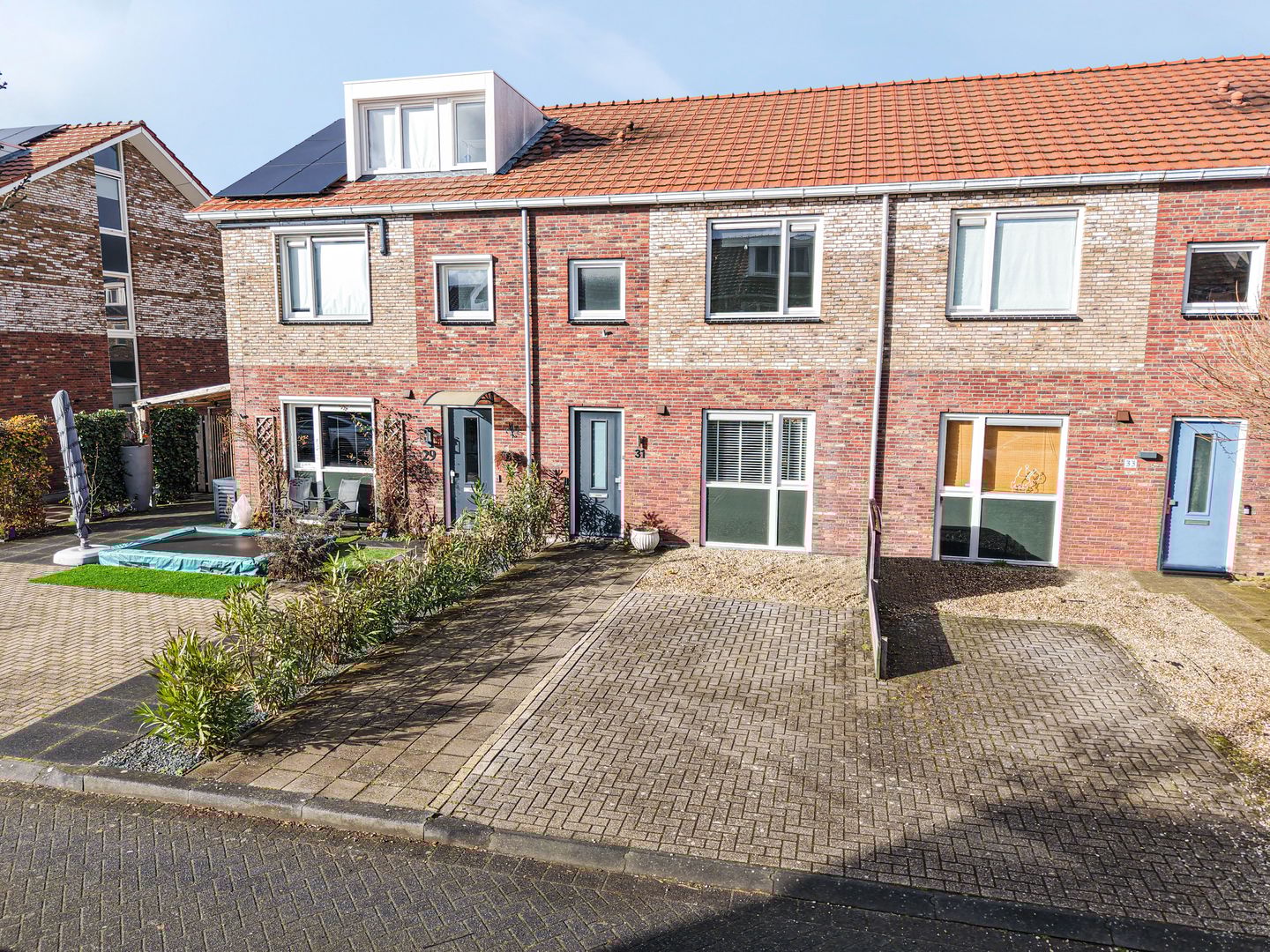 De onderhoudsvrij aangelegde achtertuin beschikt over een houten fietsenberging met overkapping. Aan de voorzijde is parkeergelegenheid voor twee auto’s op eigen terrein, comfortabel en praktisch.