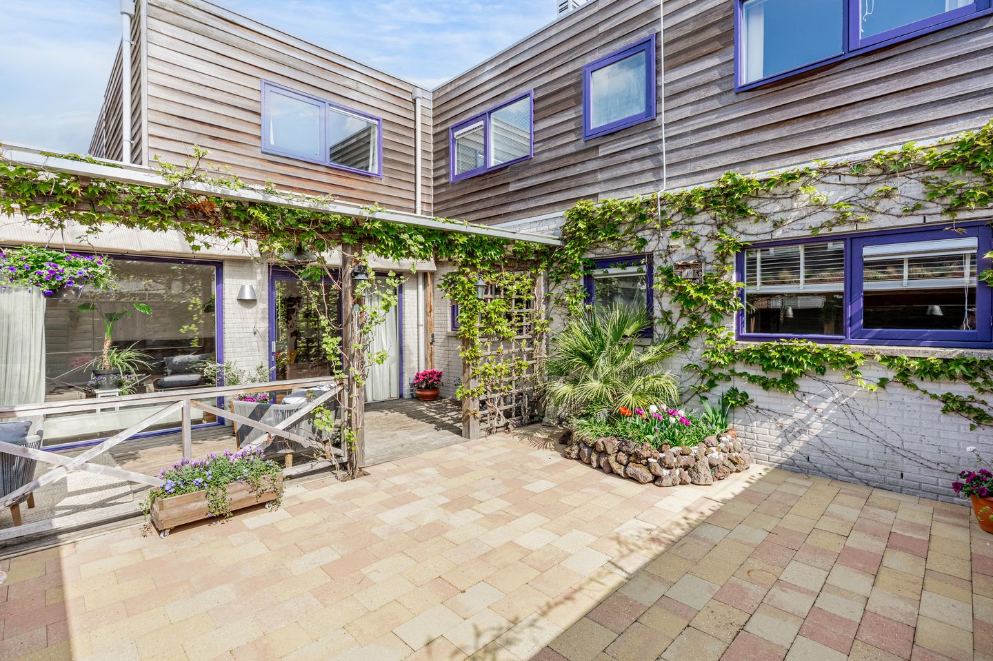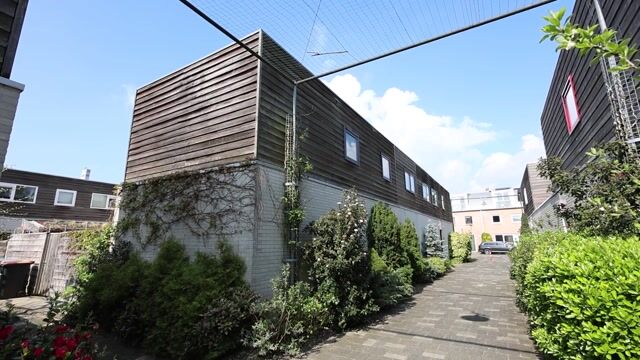 De woonkamer loopt vloeiend over in de tuin en via de schuifpui stap je zo de veranda op, waar je van het vroege voorjaar tot het late najaar heerlijk kunt ontspannen. Dankzij de beschutte ligging voelt de temperatuur in deze binnentuin al snel aangenaam aan. Het is een fijne plek om volop van het buitenleven te genieten, met zowel zonnige als schaduwrijke zitplekken. Direct aan de woning bevindt zich een overkapping, rijkelijk begroeid met diverse klimplanten, die zorgt voor een sfeervolle en beschutte plek om al vroeg in het seizoen buiten te zitten. Schuifdoeken bieden indien gewenst extra schaduw op warme dagen. Achter in de tuin staat bovendien een tweede overkapping met een fraai groen sedum dak, ideaal voor het droog en beschut stallen van fietsen of het opbergen van tuinspullen. Vanuit de tuin is ook de inpandige berging bereikbaar, wat extra praktisch is voor opslag. De achterom bereik je eenvoudig via het pad naast de woning.