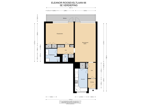 Via de entree op de vijfde verdieping betreedt u de woning. De hal biedt toegang tot de keuken aan de voorzijde, de meterkast en de ruime, lichte woonkamer. Vanuit de woonkamer is er toegang tot een tussenhal die leidt naar een handige opbergkast, een separaat toilet met fonteintje, de badkamer en de slaapkamer.
