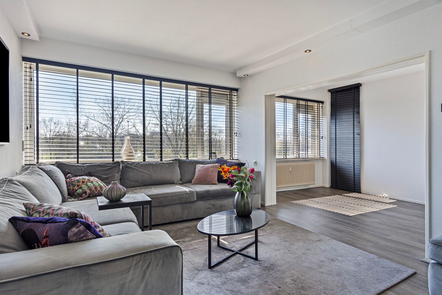 * Ruime woonkamer met veel ramen en o.a. een Cinewall