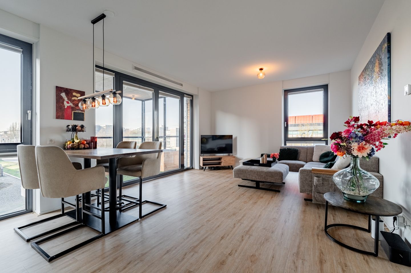 – Woonkamer met open keuken: modern, strak en lekker licht dankzij de hoekligging.