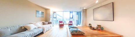 A fixed staircase leads to the generous living level. The bright living room is situated at the front and offers the same wide views as the bedroom above. The open kitchen connects seamlessly and is equipped with a gas hob, oven, fridge-freezer combination, and dishwasher. The spacious layout easily accommodates a large dining table — perfect for long dinners with friends or family. From the kitchen, you have access to a very large balcony where you can enjoy the morning sun in peace.