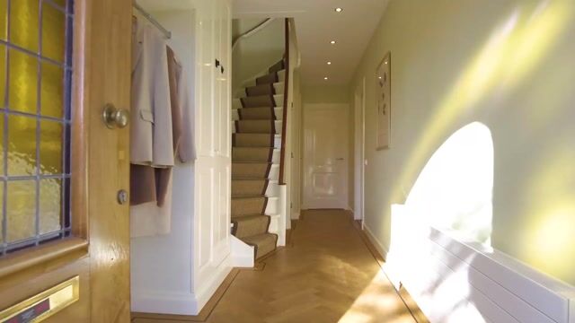 Upon entering through the stunning, characteristic round front door with stained glass, you immediately feel the home's warm atmosphere. From the hallway – which also houses a storage closet and a toilet – the corridor leads to a bright living room with a beautiful herringbone wooden floor accented with a border. Through the en-suite doors, updated in 1930s style, you reach the inviting kitchen. The fully equipped kitchen features an island, integrated appliances, a tiled floor, and underfloor heating.