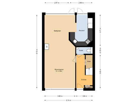 - 44 m² (7,77 meter diep en 5,69 meter breed)