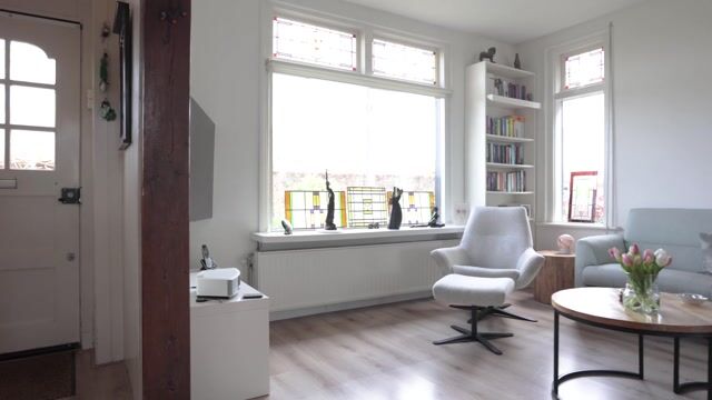 De woonkamer bevindt zich aan de voorzijde en kenmerkt zich door de karakteristieke glas-in-loodramen, een fijne zithoek en een mooi uitzicht op de groene voortuin en straat. Dankzij de grote raampartijen rondom is er een prettige lichtinval.