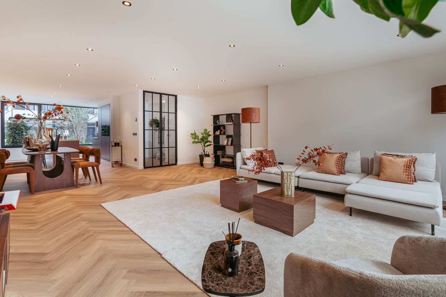 De royale woonkamer is licht, sfeervol en voorzien van comfortabele vloerverwarming. De grote schuifpui verbindt binnen moeiteloos met buiten.