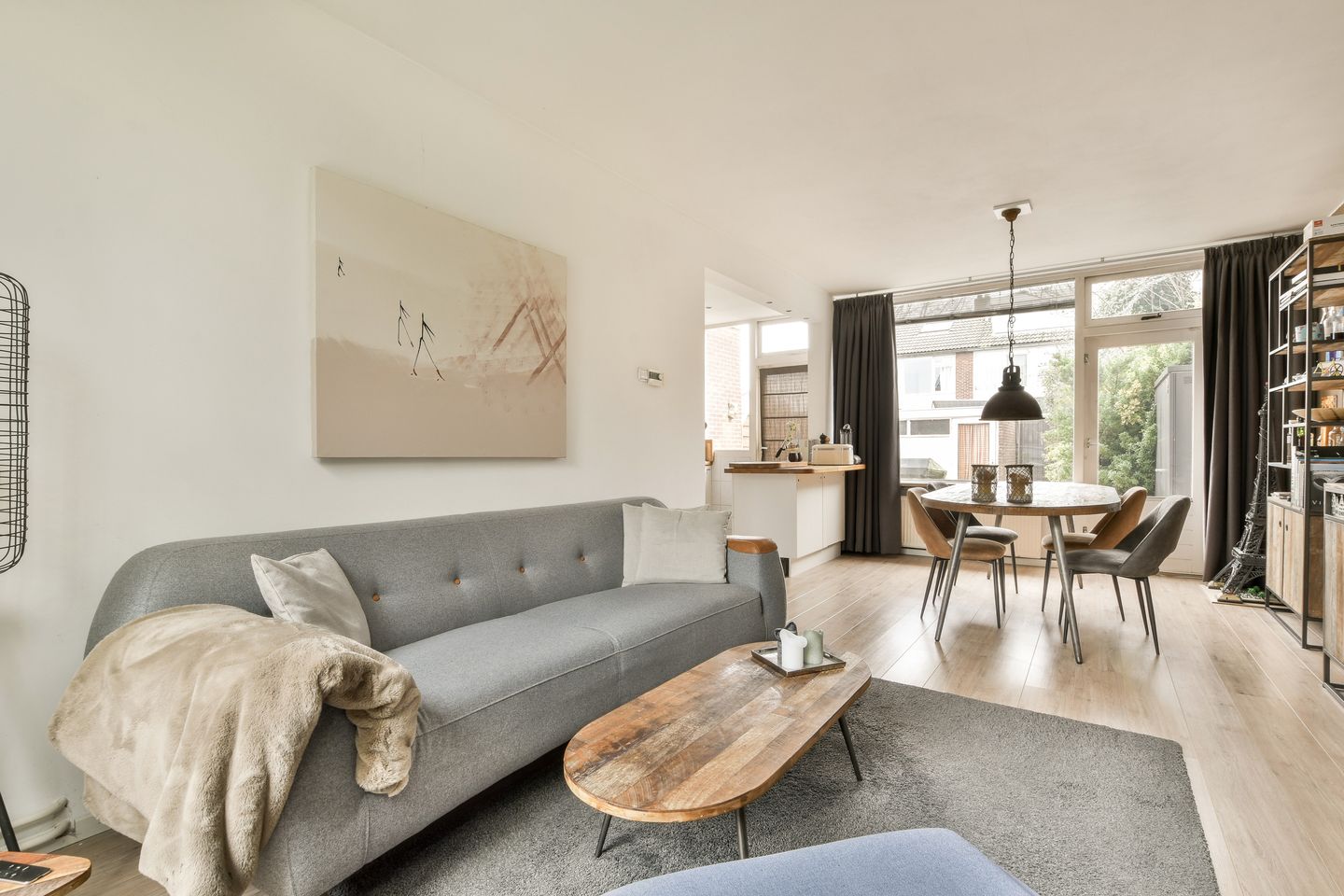 Bright and welcoming living room with large windows overlooking the front garden, allowing ample natural light. The adjacent kitchen provides a view of the spacious backyard. The southwest-facing garden (approx. 56.5 m²) includes a practical storage shed, ideal for additional storage needs.