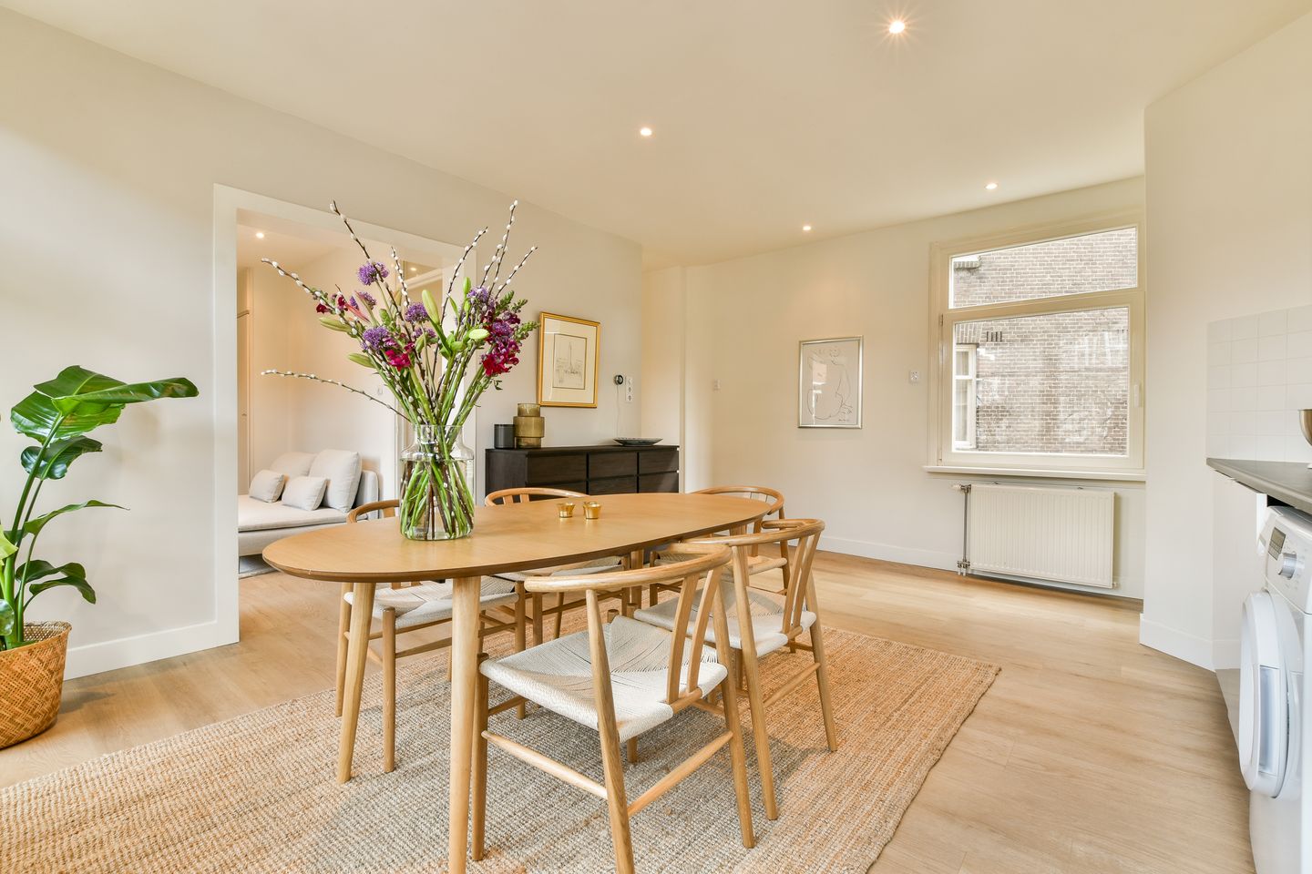 Upon entering this charming apartment, you are welcomed in an open hall that provides access to the entire apartment. The bright and cozy living room at the front radiates a warm, inviting atmosphere. Thanks to the large windows, a lot of natural light enters. The open connection with the dining room provides a spacious feeling and a natural flow between the different living spaces.