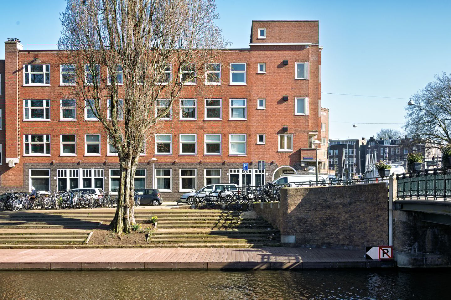 Aan de voorzijde bevindt zich de lichte woonkamer met drie ramen breed uitzicht over de Admiralengracht. De grote raampartij op het westen zorgt voor veel daglicht en een prettig uitzicht over het water.