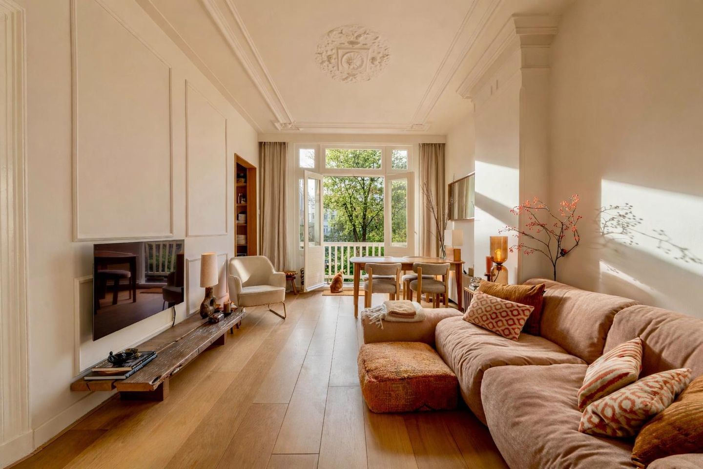 Situated on a quiet street in the highly sought-after Helmersbuurt, this fully renovated two-bedroom apartment of over 57 m² is located on own ground. The property is positioned on the second floor of a characteristic building and perfectly combines authentic charm with contemporary comfort. The high ceilings (approx. 3 meters) with beautiful ornamental detailing, decorative wall mouldings, and original ensuite doors give the apartment a classic and elegant appearance. At the same time, the kitchen, bathroom, and central heating boiler have all been recently renewed, and the entire apartment has been freshly painted. The communal staircase has also been recently renovated with new paintwork and carpeting — the overall feel is well-maintained and move-in ready. With two balconies and beautiful natural light at both the front and rear, you live here just steps away from the Vondelpark, De Hallen, and Leidseplein. A rare combination of atmosphere, quality, and location.