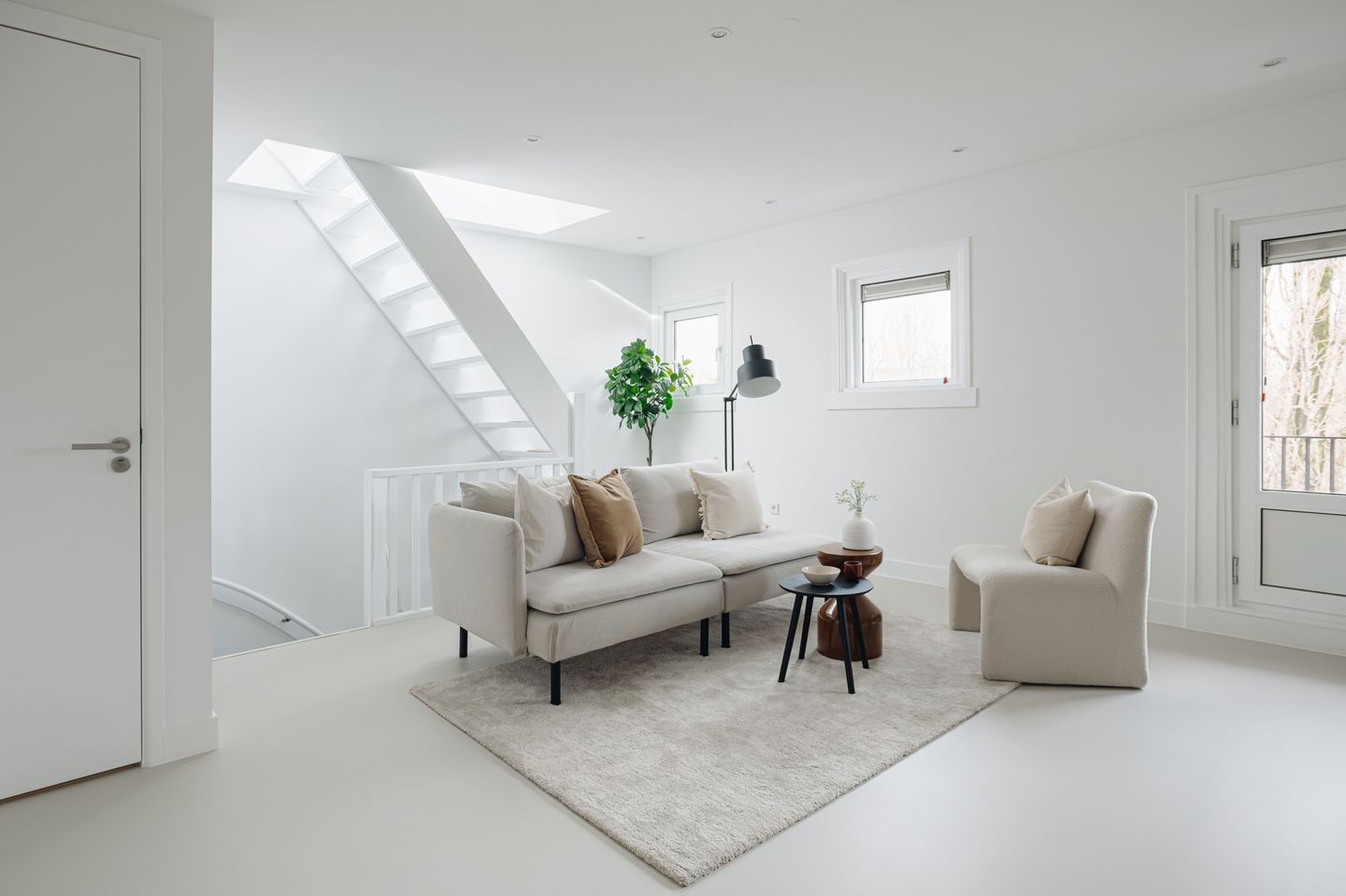 The entrance to the apartment is on the third floor, where there is immediate space for a wardrobe. The living room is located at the front and stands out for its characteristic balcony with views of the water and the trees along the quay. The light poured concrete floor provides a calm and contemporary base for the interior. Additionally, the space is equipped with air conditioning that can both cool and heat, ensuring a comfortable indoor climate throughout the year. From the living room, the roof terrace of approximately 33 m² is accessible via a fixed staircase.