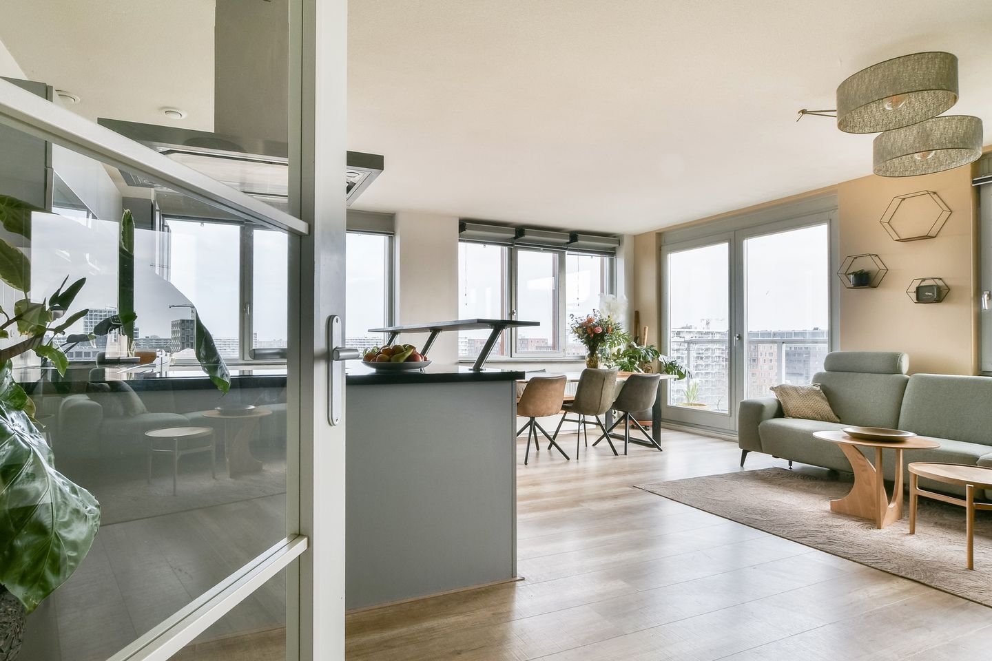 De woonkamer vormt het hart van het appartement. Dankzij de hoekligging en de grote raampartijen rondom is deze ruimte bijzonder licht en geniet je hier van een prachtig vrij uitzicht. Openslaande deuren geven toegang tot het Franse balkon op het zuiden. Vanaf hier kijk je links uit over het groene park, recht vooruit richting de Amsterdamse Poort en aan de rechterzijde op de Johan Cruijff ArenA, een uniek en dynamisch panorama.