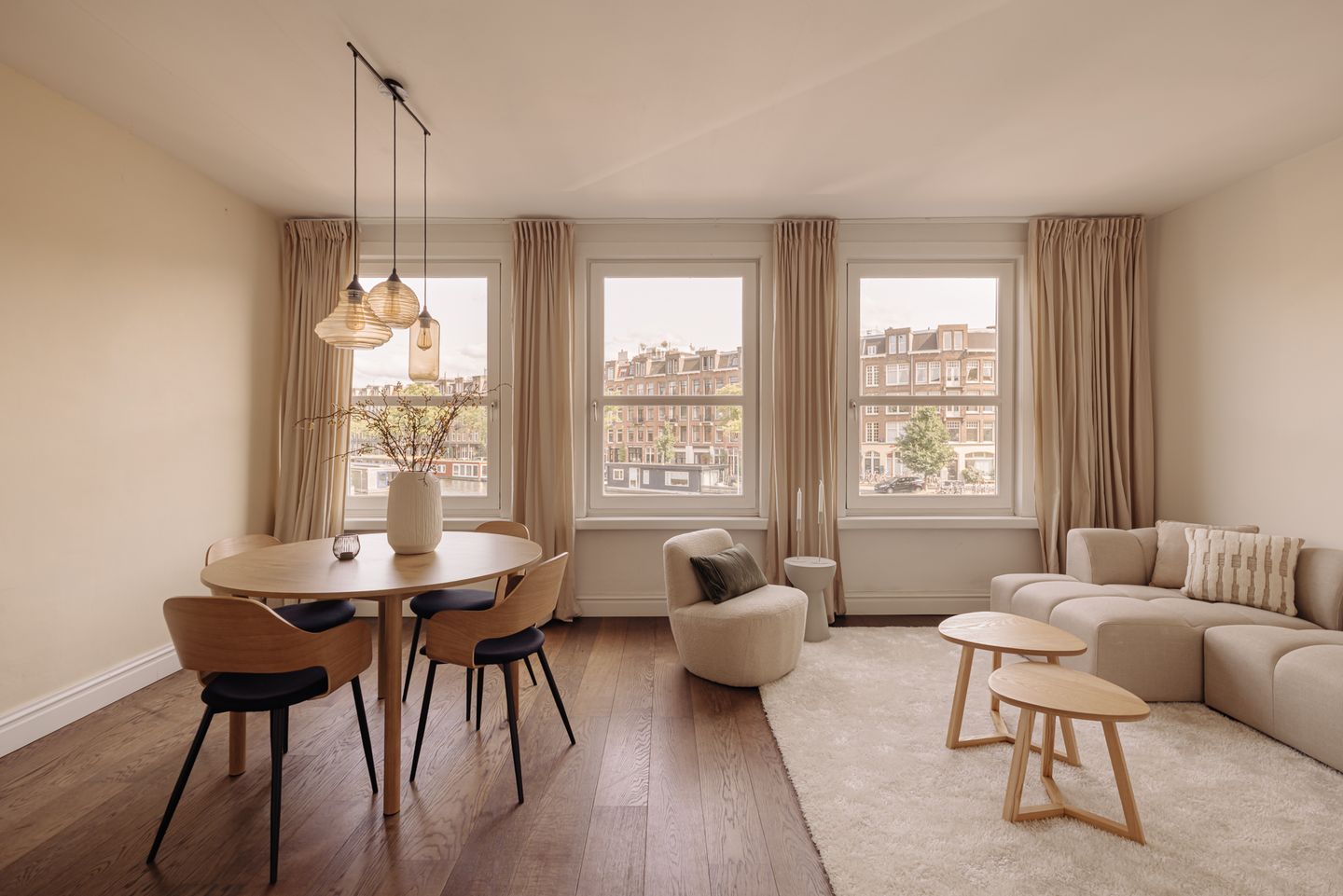 De woonkamer aan de voorzijde biedt veel lichtinval dankzij grote ramen en heeft prachtig uitzicht over het water. De keuken bevindt zich aan de achterzijde en geeft toegang tot een balkon van 5,4 m² op het westen – ideaal voor zonnige namiddagen en avonden.