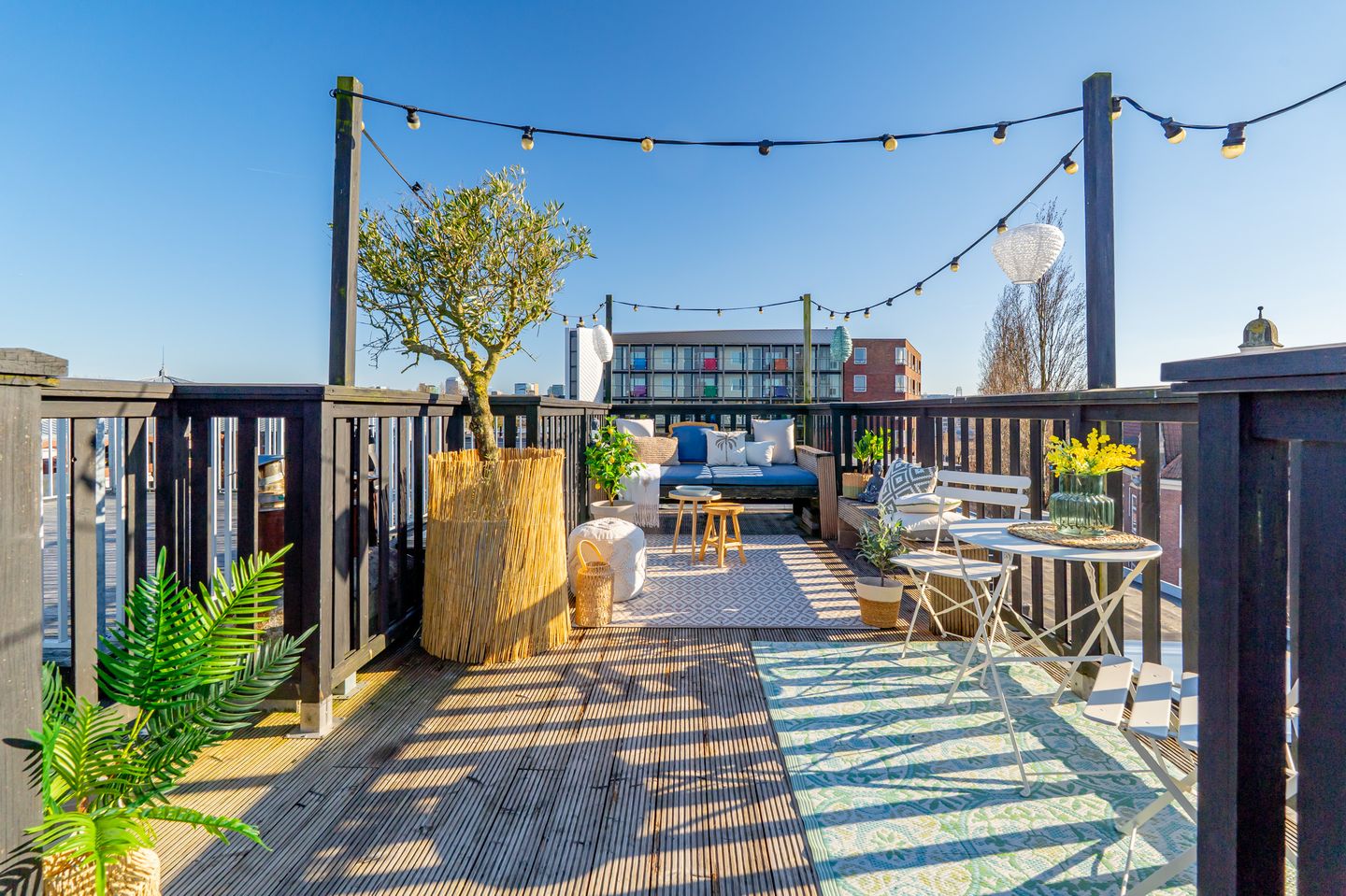 Het heerlijk, riante dakterras met elektra en water biedt een prachtig, vrij uitzicht. Hier kun je vrijwel de hele dag in alle rust en met veel privacy van de zon genieten.