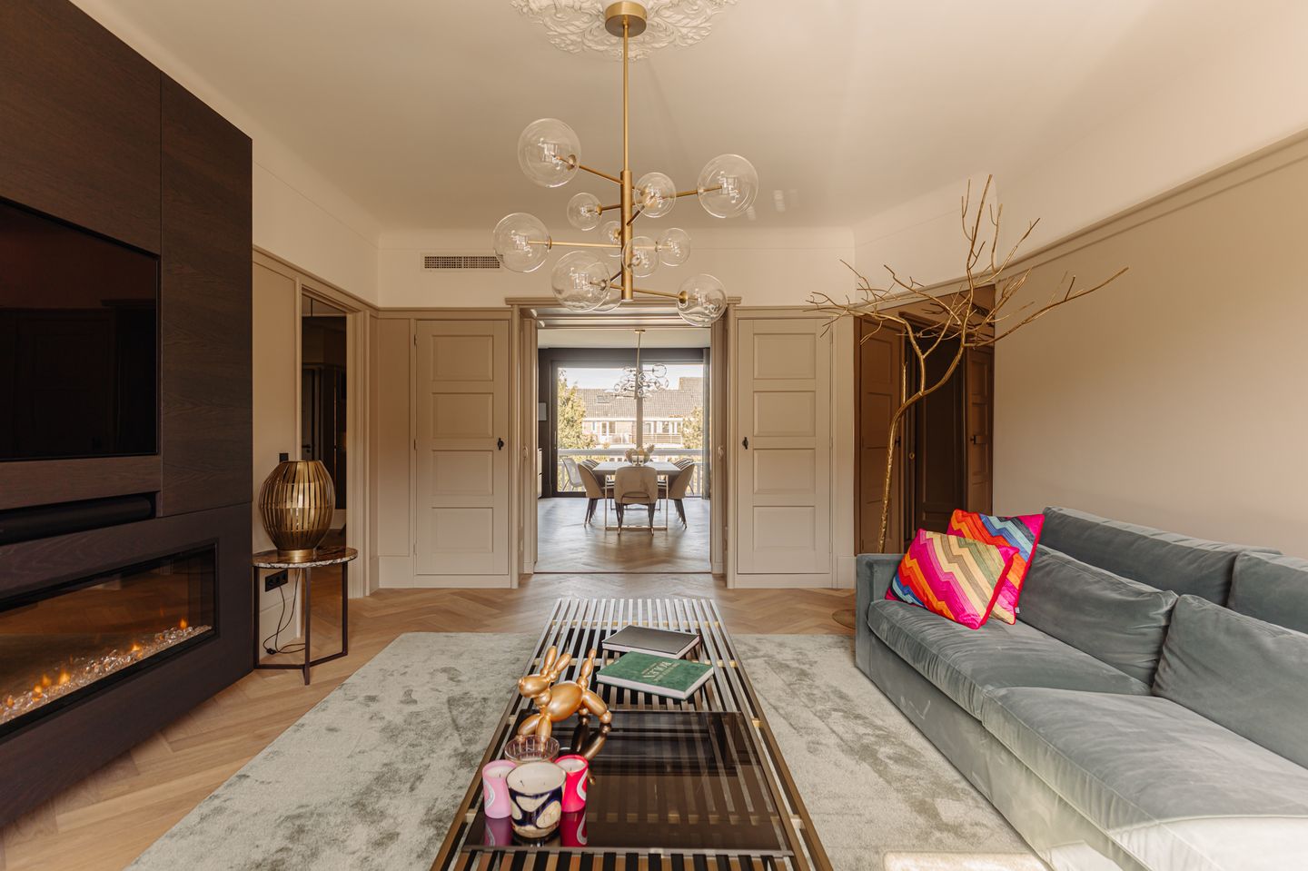 - Through the elegant en suite doors, you reach the spacious dining room at the rear, adjacent to the modern open-plan kitchen;