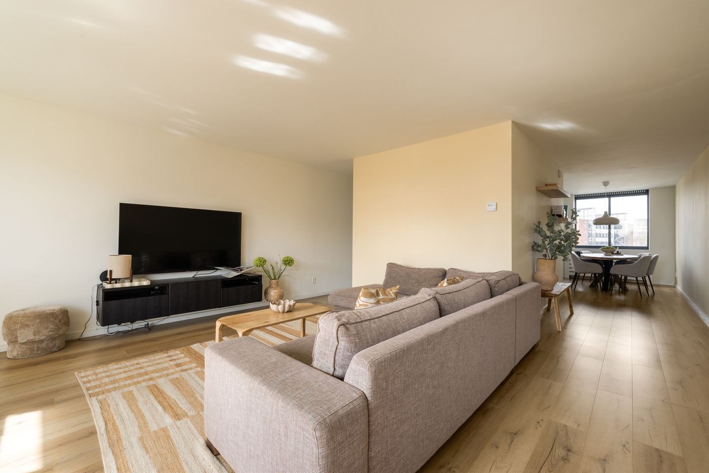 De lichte en sfeervolle woonkamer ligt aan de voorzijde van het appartement. Grote ramen zorgen voor een overvloed aan daglicht en geven toegang tot het balkon op het zonnige zuiden. Hier geniet je in alle rust van de middagzon en het vrije uitzicht op het groen.