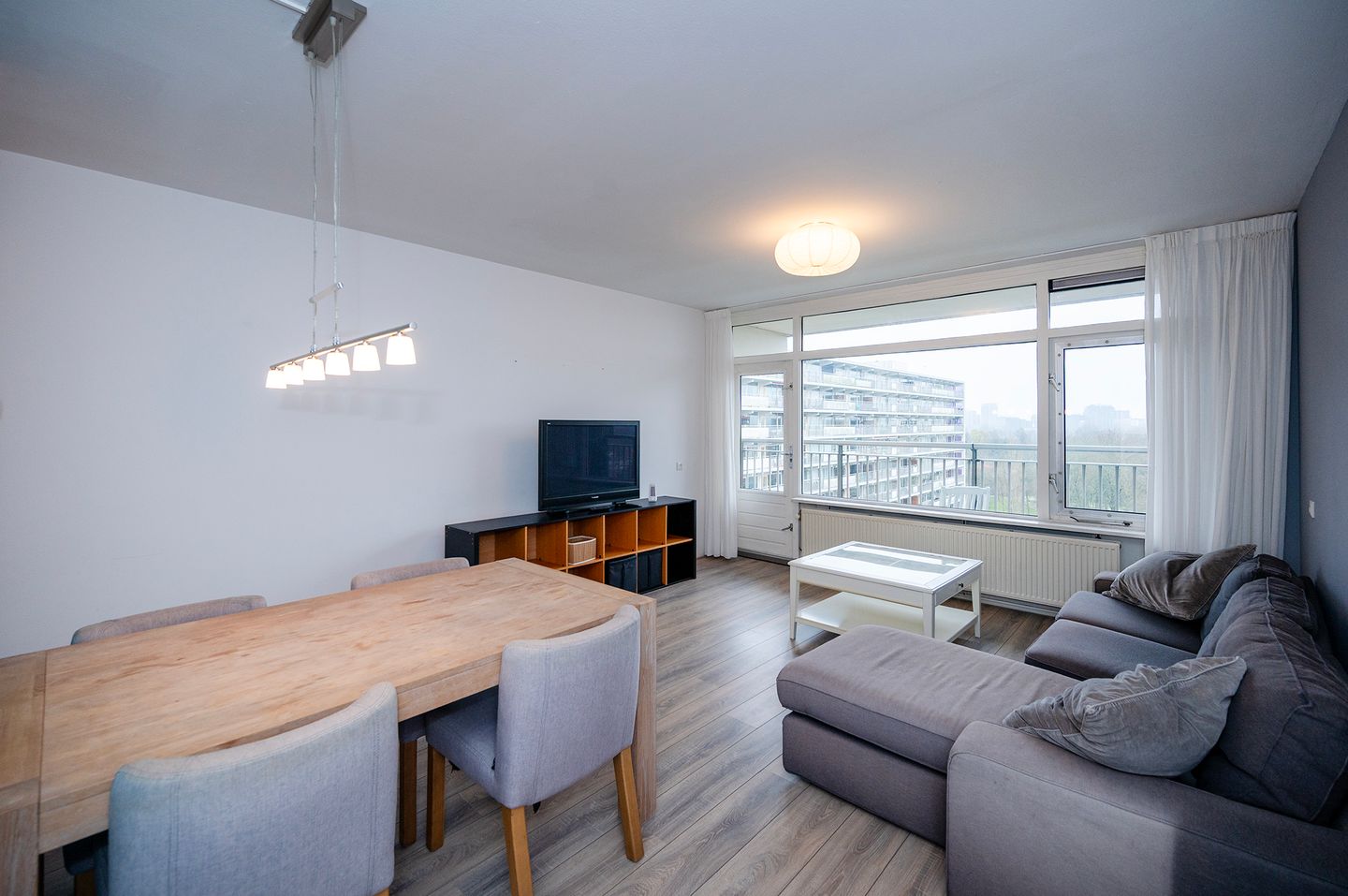 De woonkamer is ruim opgezet en profiteert van veel natuurlijk licht. Via de balkondeur stap je zo het balkon op, dat zich uitstrekt over de volledige breedte van het appartement. Dankzij de ligging op het zuiden is dit een heerlijke plek om van de zon te genieten.