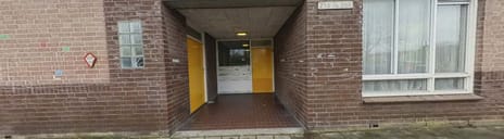 Via de gezamenlijke entree, voorzien van brievenbussentableau en trapopgang, bereik je de toegangsdeur van het appartement. De centrale hal is netjes onderhouden en biedt direct een overzichtelijke route naar boven.