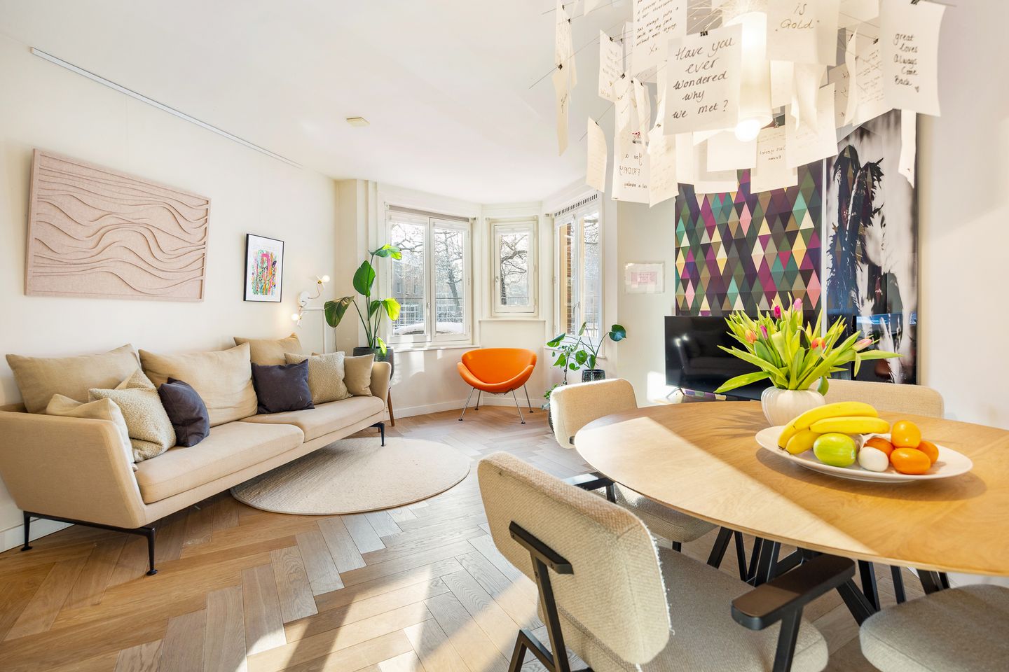 De ruime woon-/eetkamer van circa (16m2) ligt aan de voorzijde van de woning en is heerlijk licht doordat het vrij uitzicht heeft op het plein. Dankzij de gunstige ligging en openslaande ramen kan je heerlijk van de zonnestralen genieten vanaf de op maat gemaakte vensterbanken.